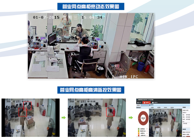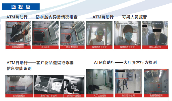 智能预警分析:提供对在银行自助机具粘贴虚假广告、安装假面板、安装架、读卡器以及对自助区里的一些异常行为实现报警提醒,确保储户的人身财产安全。