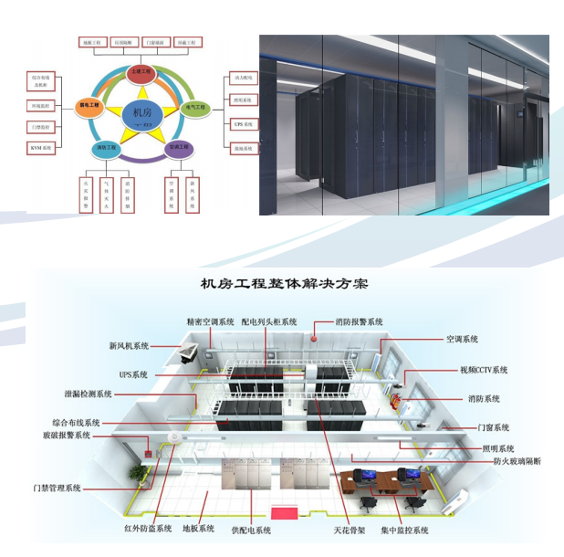 机房工程是智能化系统的一个重要部分,包括机房装饰装修、供配电系统、空调新风系统、消防报警系统、防雷接地系统、安防系统、机房动力环境监控系统等。机房工程一般指数据中心,是全球协作的特定设备网络,用来在interet网络基础设施上传递、加速、展示、计算、存储数据信息。